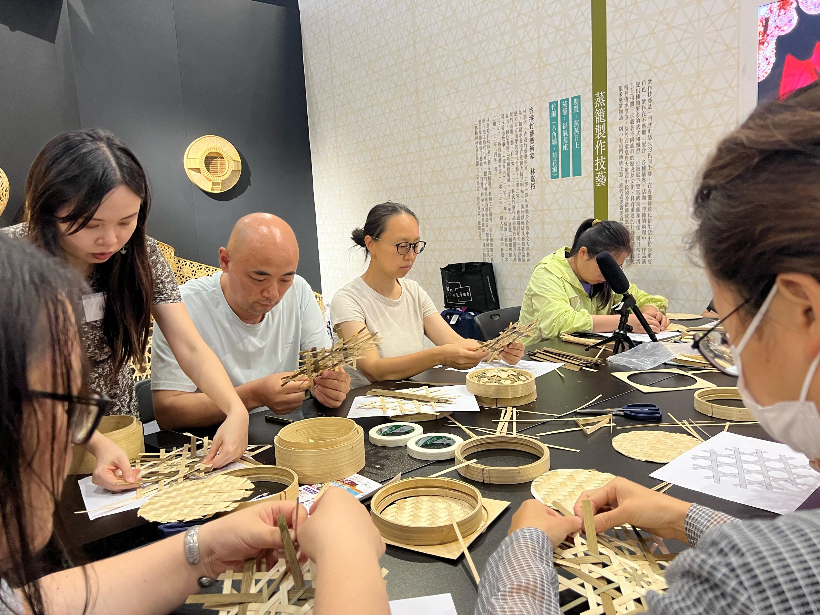 非遗传承人还从香港来到北京,面对面与观众交流。香港竹艺艺术家林嘉裕将竹子转化为艺术语言,她的作品在世界多地展出,通过大屏幕她展示着自己的作品,她以香港尖沙咀钟楼为原型制作了上下共三层的蒸笼,最终被顾客以4万元港币买下。随后,她还邀请观众来到现场设置的手工作坊,亲自指导观众制作蒸笼。体验者李女士说,一个小小的蒸笼制作起来并不容易。